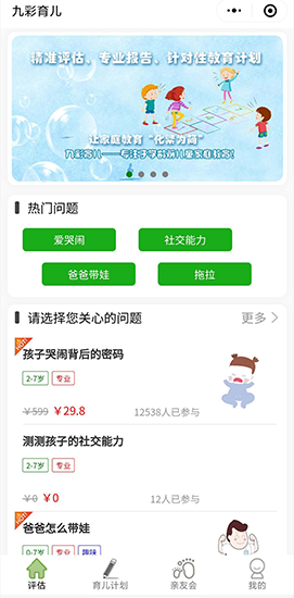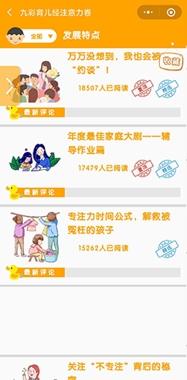 目前的版块主要聚焦于“孩子哭闹”、“社交能力”、“孩子的专注力”、“爸爸带孩子”等等问题。往后也会逐步涉及更多孩子的相关问题,最终我们的目标是成为优秀的有用的好程序!