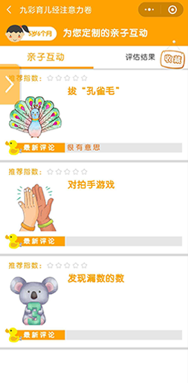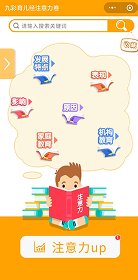 九彩育儿经专注力卷是九彩育儿下第一款分类小程序,它意味着我们的内容走向更专业更专注,也意味着会有更多的分类程序。